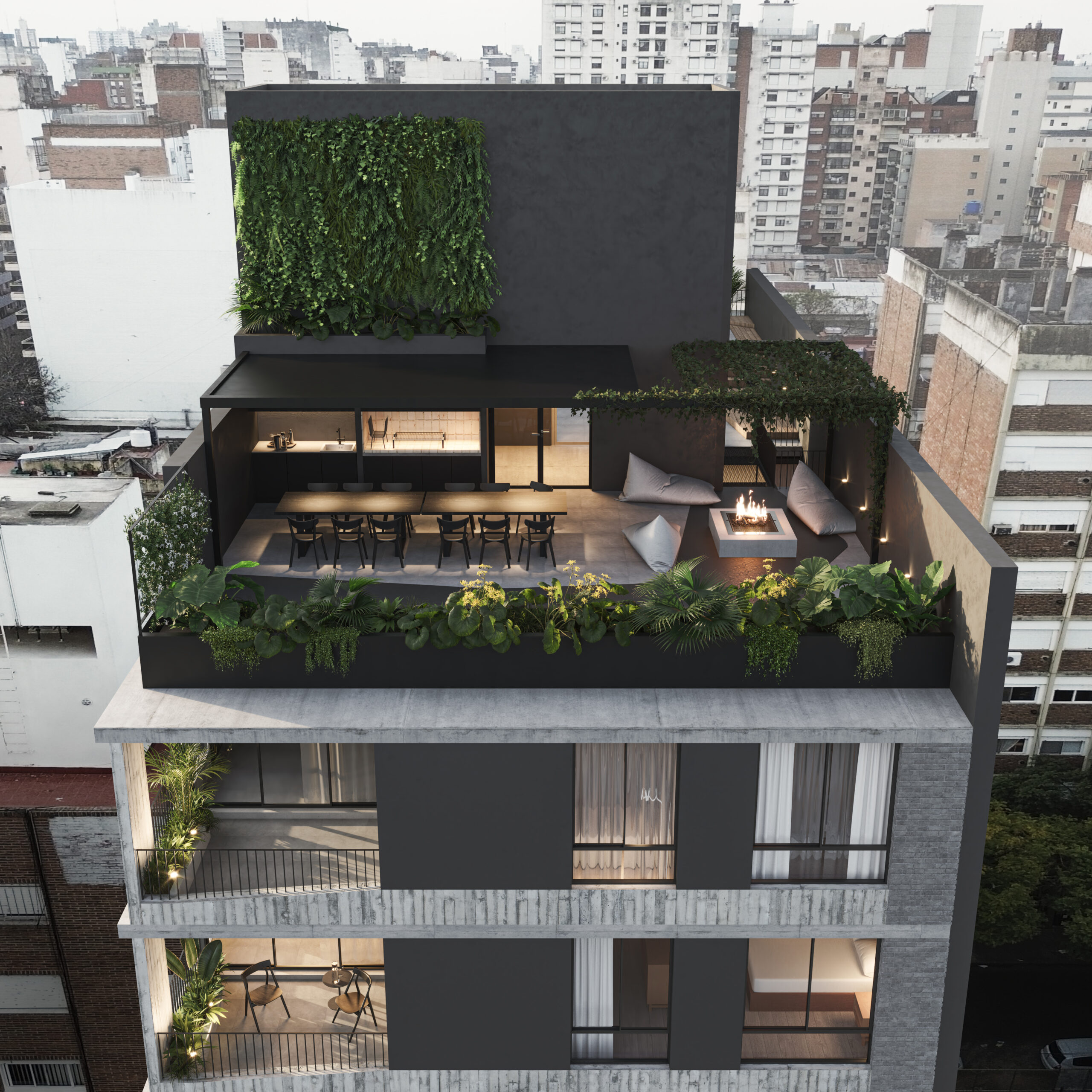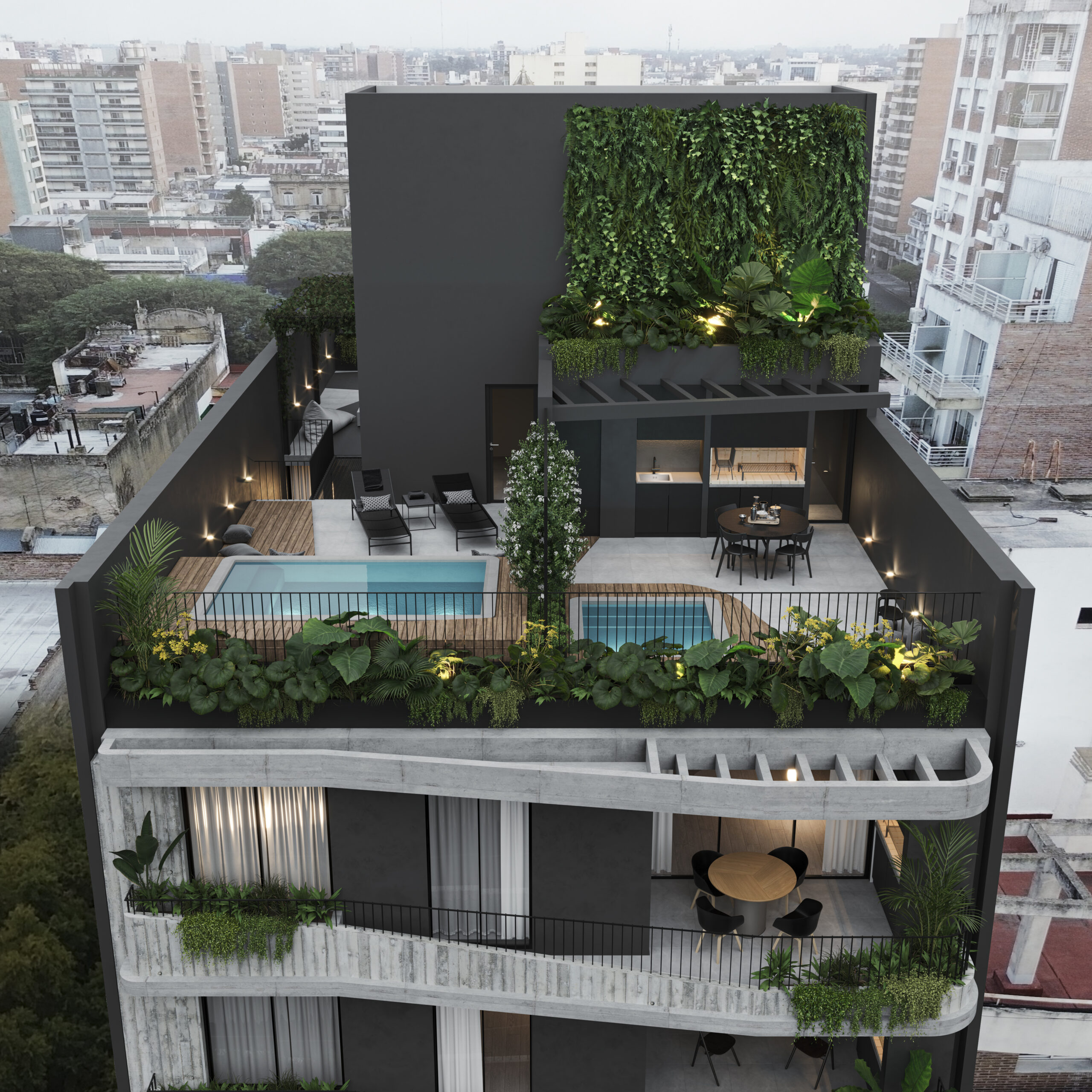 – BALCÓN: Canteros integrados a la estructura del edificio, provistos de vegetación y automatizados con riego por goteo. Estructuras metálicas con vegetación.